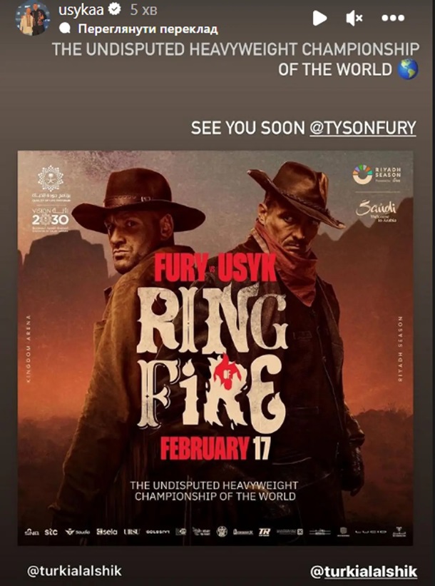 Нагадаємо, Усик битиметься з Ф’юрі 17 лютого у столиці Саудівської Аравії Ер-Ріяді.